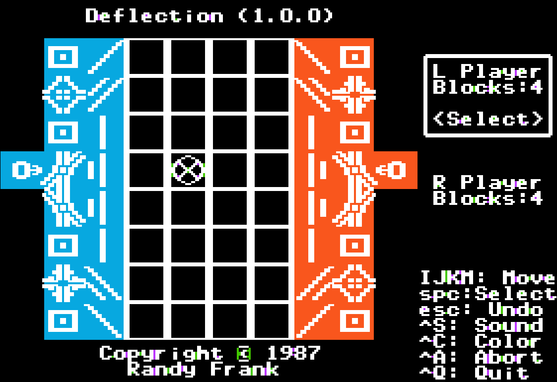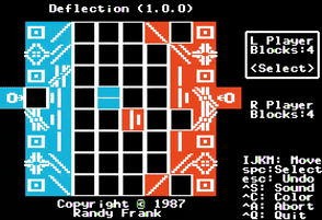 This is an old board game written back in 1987 for the Apple II. Patterned after chess and an old physical board game of the same name, the idea is to place a collection of reflective panels, beam splitters and light-pipes to protect your four 'key' blocks. On each turn one can move one piece any number of unblocked squares north, south, east or west and then rotate the piece. Alternatively, a player may opt to move and fire a laser from the back row. If a laser hits a unit from an unprotected direction, the piece is destroyed. Play continues back and forth until one player has lost all of their 'key' blocks.
